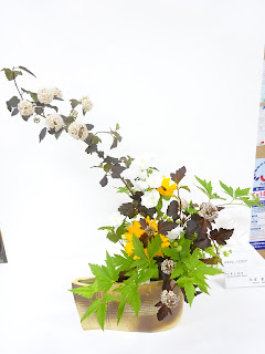 花材: イチイ、ギボウシ、アストランティア、ケムリソウ、アジサイ